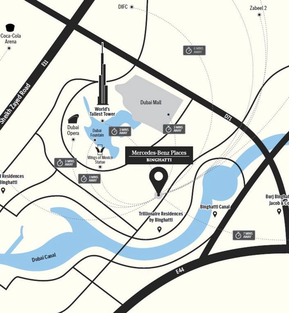 • Downtown Dubai, renowned as the heart of the city, is an ever-evolving urban destination, and it’s here that Mercedes-Benz Places by Binghatti proudly stands. This area is known for its iconic landmarks, including the majestic Burj Khalifa and the sprawling Dubai Mall. Mercedes-Benz Places, nestled in this vibrant neighborhood, epitomizes luxury living amidst high-rise apartments and lavish villas. Its prime location along Sheikh Zayed Road and near Business Bay ensures easy connectivity, making it ideal for both pedestrians and frequent travelers. Downtown Dubai, with its upscale hotels, leisure spots, and extensive shopping centers, offers a dynamic lifestyle, positioning Mercedes-Benz Places as a premier address in the heart of Dubai’s liveliness.